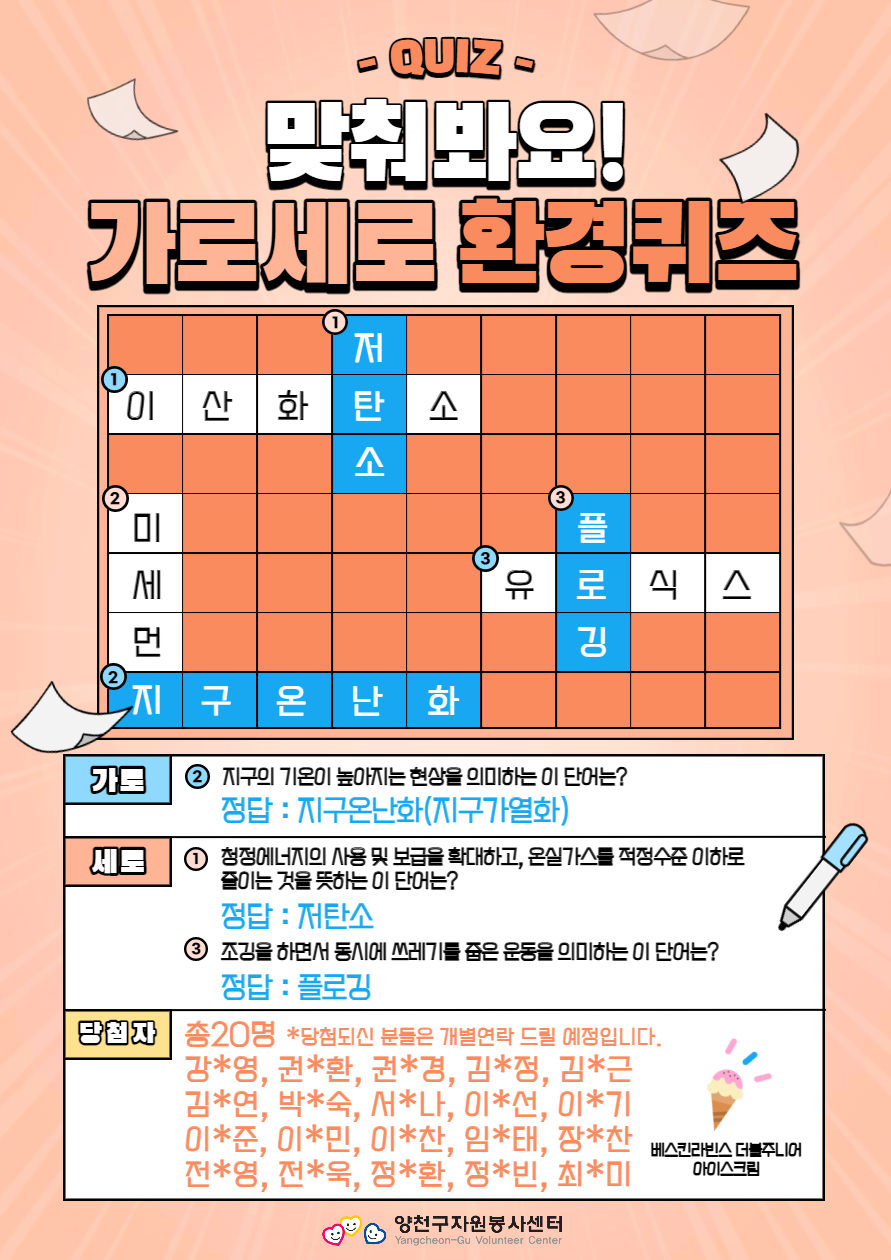 [이벤트] 맞춰봐요! 가로세로 환경퀴즈! 당첨자 발표!센터소식/공지사항 2021. 6. 1. 09:39