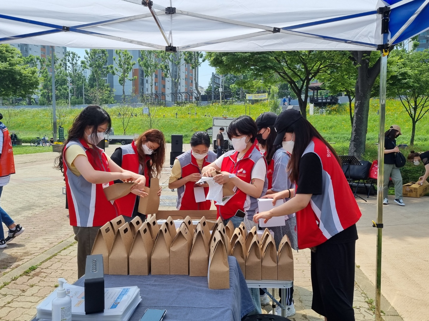우선 천막을 설치하고 자원봉사자들 출석체크와 발열체크, 손소독제까지 꼼꼼하게....